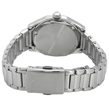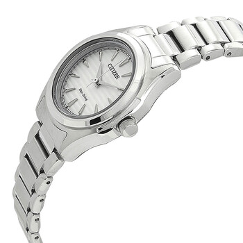 Silver-tone stainless steel case and bracelet. Fixed silver-tone stainless steel bezel. Silver dial with silver-tone hands and index hour markers. Minute markers around the outer rim. Dial Type: Analog. Citizen Caliber Eco-Drive J730 eco-drive movement. Scratch resistant mineral crystal. Pull / push crown. Solid case back. Round case shape, case size: 31.3 mm, case thickness: 8.6 mm. Band width: 16 mm. Fold over clasp with a safety release. Water resistant at 100 meters / 330 feet. Functions: hour, minute, second, solar-powered. Dress watch style. Watch label: Japan Movt. Citizen Eco-Drive Silver Dial Ladies Watch FE2110-81A.
