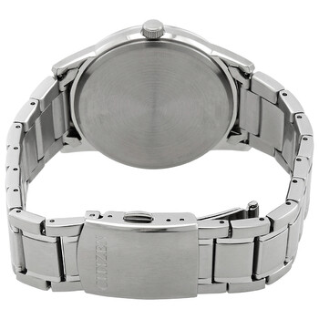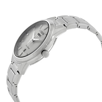 Silver-tone stainless steel case and bracelet. Fixed silver-tone stainless steel bezel. Silver-tone dial with silver-tone hands and index hour markers. Arabic numeral minute markers (at 5 minute intervals). Dial Type: Analog. Date display at the 6 o'clock position. day display below the 12 o'clock position. Citizen Caliber Eco-Drive J800 eco-drive movement. Scratch resistant mineral crystal. Solid case back. Round case shape, case size: 40 mm, case thickness: 10 mm. Band width: 21 mm. Fold over clasp with a safety release. Water resistant at 30 meters / 100 feet. Functions: date, day, hour, minute, second, solar-powered. Sport watch style. Watch label: Japan Movt. Citizen Eco-Drive Silver Dial Men's Watch AW0100-86A.