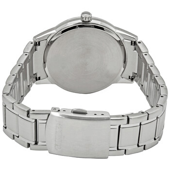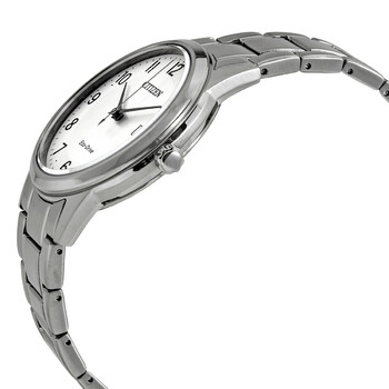 Stainless steel case with a stainless steel bracelet. Fixed stainless steel bezel. Silver dial with black hands and Arabic numeral hour markers. Minute markers around the outer rim. Dial Type: Analog. Date display at the 3 o'clock position. Citizen caliber Eco-Drive J810 eco-drive movement. Scratch resistant mineral crystal. Pull / push crown. Solid case back. Round case shape. Case size: 40 mm. Case thickness: 9 mm. Band width: 20 mm. Fold over clasp with a safety release. Water resistant at 100 meters / 330 feet. Functions: date, hour, minute, second, solar-powered. Casual watch style. Watch label: Japan Movt. Citizen Eco-Drive Silver Dial Men's Watch AW1231-58B.