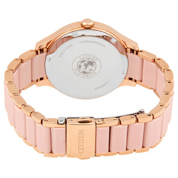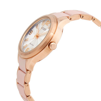 Rose gold-tone stainless steel case with a rose gold tone stainless steel bracelet with a pink silicone center. Fixed rose gold-tone bezel. Silver dial with luminous rose gold-tone hands and index hour markers. Arabic numerals mark the 3, 6, 9 and 12 o'clock positions. Dial Type: Analog. Luminescent hands and markers. Calibre J830 eco-drive movement. Scratch resistant mineral crystal. Pull / push crown. Solid case back. Round case shape. Case size: 36.8 mm. Case thickness: 9 mm. Band width: 14 mm. Fold over clasp with a push button release. Water resistant at 100 meters / 330 feet. Functions: hour, minute, second. Eco-drive Series. Dress watch style. Watch label: Japan Movt. Citizen Eco-Drive Silver Dial Rose Gold tone Ladies Watch FE7078-85A.