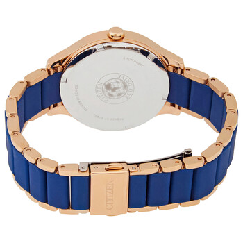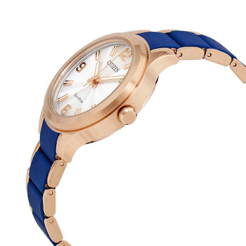 Rose gold-tone stainless steel case with a rose gold-tone stainless steel bracelet with a blue silicone center . Fixed rose gold-tone bezel. Silver dial with luminous rose gold-tone hands and index hour markers. Arabic numerals mark the 3, 6, 9 and 12 o'clock positions. Dial Type: Analog. Luminescent hands and markers. Calibre J830 eco-drive movement. Scratch resistant mineral crystal. Pull / push crown. Solid case back. Round case shape. Case size: 36.8 mm. Case thickness: 9 mm. Band width: 14 mm. Fold over clasp with a push button release. Water resistant at 100 meters / 330 feet. Functions: hour, minute, second. Eco-drive Series. Dress watch style. Watch label: Japan Movt. Citizen Eco-Drive Silver Dial Rose Gold-tone Ladies Watch FE7078-93A.