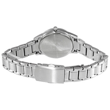 Stainless steel case with a stainless steel bracelet. Fixed stainless steel bezel. Silver dial with silver-tone hands and index hour markers. Minute markers around the outer rim. Dial Type: Analog. Date display at the 3 o'clock position. Eco-drive movement. Scratch resistant mineral crystal. Pull / push crown. Solid case back. Round case shape. Case size: 29.4 mm. Case thickness: 8.3 mm. Band width: 14 mm. Fold over clasp with a push button release. Water resistant at 50 meters / 165 feet. Functions: date, hour, minute, second. Eco-drive Series. Casual watch style. Watch label: Japan Movt. Citizen Eco-Drive Silver Dial Stainless Steel Ladies Watch FE1081-59A.