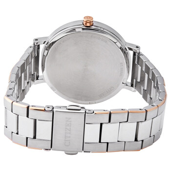 Stainless steel case with a two-tone (silver-tone and rose gold-tone) stainless steel bracelet. Fixed stainless steel bezel with a rose gold-tone ring. Silver dial with rose gold-tone hands and index hour markers. Minute markers around the outer rim. Dial Type: Analog. Citizen caliber Eco-Drive E031 eco-drive movement. Scratch resistant mineral crystal. Pull / push crown. Solid case back. Round case shape. Case size: 36 mm. Case thickness: 8.9 mm. Band width: 16 mm. Fold over clasp. Water resistant at 100 meters / 330 feet. Functions: hour, minute, second, solar-powered. Casual watch style. Watch label: Japan Movt. Citizen Drive Silver Dial Two-tone Ladies Watch EM0766-50A.
