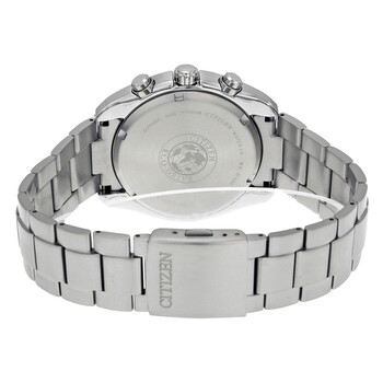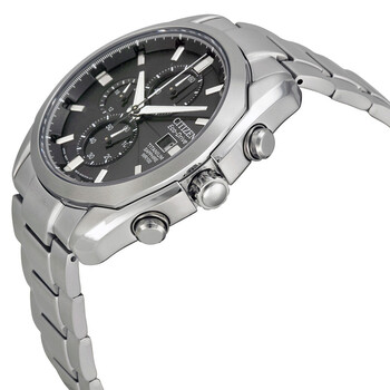 Titanium case with a titanium bracelet. Fixed titanium bezel. Black dial with luminous hands and index hour markers. Minute markers around the outer rin. Luminescent hands and markers. Date display at the 3 o'clock position. Chronograph - three sub-dials displaying: 24 hours, 30 minutes and 60 seconds. Japanese quartz movement. Scratch resistant anti-reflective sapphire crystal. Textured steel crown. Solid case back. Case diameter: 43 mm. Case thickness: 11 mm. Fold over with push button release clasp. Water resistant at 100 meters / 330 feet. Functions: hours, minutes, seconds, calendar, chronograph. Citizen Eco-Drive Titanium Chronograph Men's Watch CA0020-56E.