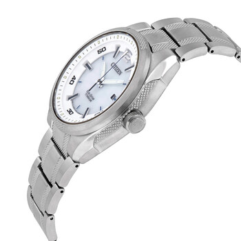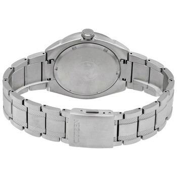 Grey titanium case with a grey titanium bracelet. Fixed grey titanium bezel. White dial with luminous silver-tone hands and index hour markers. An Arabic numeral appears at the 12 o'clock position. Minute markers around the inner rim. Dial Type: Analog. Luminescent hands and markers. Date display at the 3 o'clock position. Citizen caliber Eco-Drive E111 eco drive movement. Scratch resistant sapphire crystal. Solid case back. Round case shape. Case size: 43 mm. Case thickness: 12 mm. Band width: 22 mm. Fold over clasp with a push button release. Water resistant at 100 meters / 330 feet. Functions: date, hour, minute, second, solar-powered. Casual watch style. Watch label: Japan Movt. Citizen Eco-Drive Titanium White Dial Men's Watch BM6901-55B.