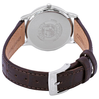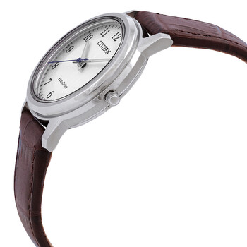 Stainless steel case with a brown leather strap. Fixed stainless steel bezel. White dial with luminous silver-tone hands and Arabic numeral hour markers. Minute markers around the outer rim. Dial Type: Analog. Luminescent hands. Date display at the 3 o'clock position. Citizen caliber J810 eco-drive movement with a 240-day power reserve. Scratch resistant mineral crystal. Pull / push crown. Solid case back. Round case shape. Case size: 32 mm. Case thickness: 8.2 mm. Band width: 17 mm. Tang clasp. Water resistant at 50 meters / 165 feet. Functions: date, hour, minute, second. Eco-drive Series. Casual watch style. Watch label: Japan Movt. Citizen Eco-Drive White Dial Brown Leather Ladies Watch FE6011-14A.