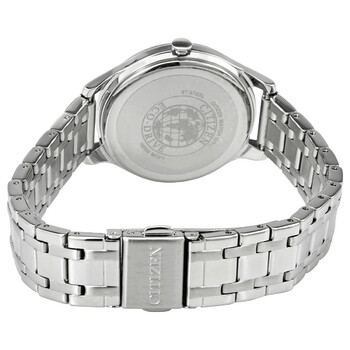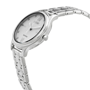 Stainless steel case with a stainless steel bracelet. Fixed stainless steel bezel. White dial with silver-tone hands and index hour markers. Roman numerals at the 6 and 12 o'clock positions. Dial Type: Analog. Citizen caliber Eco-Drive E031 eco-drive movement. Scratch resistant mineral crystal. Pull / push crown. Solid case back. Round case shape. Case size: 32 mm. Case thickness: 7 mm. Band width: 13 mm. Fold over clasp with a push button release. Water resistant at 50 meters / 165 feet. Functions: hour, minute, second. Dress watch style. Citizen Eco-drive White Dial Elegant Ladies Watch EM0500-73A.