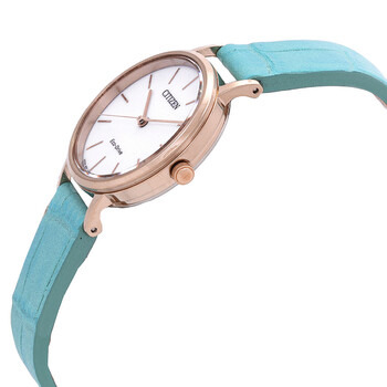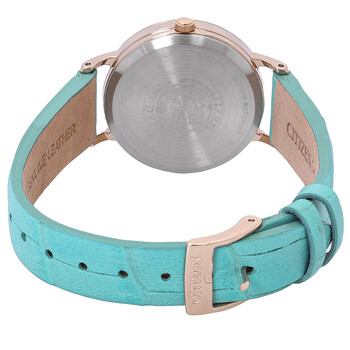 Rose gold-tone stainless steel case with a blue leather strap. Fixed rose gold-tone stainless steel bezel. White dial with rose gold-tone hands and index hour markers. Dial Type: Analog. Citizen Caliber Eco-Drive E031 eco-drive movement. Scratch resistant mineral crystal. Pull / push crown. Solid case back. Round case shape, case size: 30.2 mm, case thickness: 7.5 mm. Tang clasp. Water resistant at 50 meters / 165 feet. Functions: hour, minute, second. Casual watch style. Watch label: Japan Movt. Citizen Eco-Drive White Dial Ladies Watch EM0577-36A.
