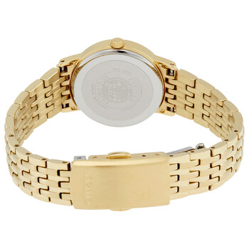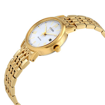 Yellow gold-tone stainless steel case and bracelet. Fixed yellow gold-tone bezel. White dial with yellow gold-tone hands and alternating index and Roman numeral hour markers. Minute markers around the outer rim. Dial Type: Analog. Date display at the 3 o'clock position. Citizen caliber Eco-Drive E011 eco-drive movement. Scratch resistant sapphire crystal. Pull / push crown. Solid case back. Round case shape. Case size: 27 mm. Case thickness: 8 mm. Band width: 14 mm. Fold over clasp with a push button release. Water resistant at 30 meters / 100 feet. Functions: date, hour, minute, second, solar-powered. Casual watch style. Watch label: Japan Movt. Citizen Eco-Drive White Dial Ladies Watch EW1582-54A.