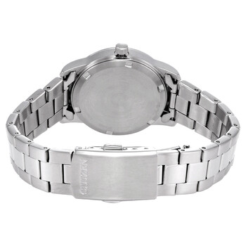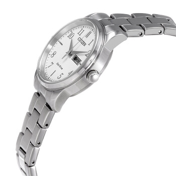 Stainless steel case with a stainless steel bracelet. Fixed stainless steel bezel. White dial with silver-tone hands and Arabic numeral hour markers. Index markers appear at the 3, 6, 9 and 12 o'clock positions. Minute markers around the outer rim. Dial Type: Analog. Day of the week and date display at the 3 o'clock position. Citizen caliber Eco-Drive E001 eco-drive movement. Scratch resistant mineral crystal. Pull / push crown. Solid case back. Round case shape. Case size: 30 mm. Band width: 16 mm. Fold over clasp with a safety release. Water resistant at 100 meters / 330 feet. Functions: date, day, hour, minute, second, solar-powered. Casual watch style. Watch label: Japan Movt. Citizen Eco-Drive White Dial Ladies Watch EW3261-57A.