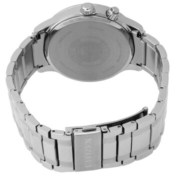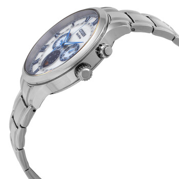 Silver-tone stainless steel case and bracelet. Fixed silver-tone stainless steel bezel. White dial with blue hands and Roman numeral hour markers. Dial Type: Analog. Three sub-dials displaying: day, month and moon phase. Eco-drive movement. Scratch resistant sapphire crystal. Solid case back. Round case shape, case size: 42.2 mm, case thickness: 10.1 mm. Fold over clasp with a safety release. Water resistant at 50 meters / 165 feet. Functions: date, day, month, hour, minute, second, mooh phase. Dress watch style. Watch label: Japan Movt. Citizen Eco-Drive White Dial Moon Phase Men's Watch AP1050-81A.