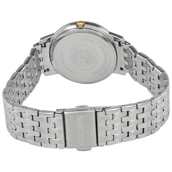 Stainless steel case with a stainless steel bracelet. Fixed stainless steel bezel. White dial with gold-tone hands and index hour markers. Arabic numeral appears at the 6 and 12 o'clock positions. Dial Type: Analog. Citizen caliber B023 eco-drive movement. Scratch resistant sapphire crystal. Pull / push crown. Solid case back. Round case shape. Case size: 29.4 mm. Case thickness: 6.5 mm. Fold over clasp with a push button release. Water resistant at 50 meters / 165 feet. Functions: hour, minute. Eco-drive Series. Casual watch style. Watch label: Japan Movt. Citizen Eco-Drive White Dial Stainless Steel Ladies Watch EX1498-87A.