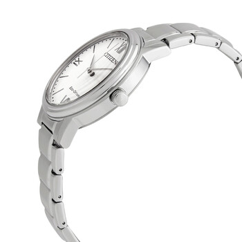 Stainless steel case with a stainless steel bracelet. Fixed stainless steel bezel. White dial with silver-tone hands and index hour markers. Roman numeraals appear at the 3, 6, 9 and 12 o'clock positions. Minute markers around the outer rim. Dial Type: Analog. Date display at the 3 o'clock position. Citizen caliber J810 eco-drive movement with a 240-day power reserve. Scratch resistant mineral crystal. Pull / push crown. Solid case back. Round case shape. Case size: 41.5 mm. Case thickness: 10.3 mm. Band width: 20 mm. Fold over clasp with a push button release. Water resistant at 100 meters / 330 feet. Functions: date, hour, minute, second. Casual watch style. Watch label: Japan Movt. Citizen Eco-Drive White Dial Stainless Steel Men's Watch AW1670-82A.