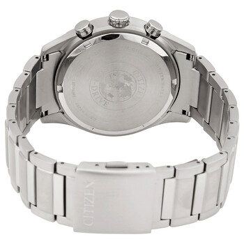 Grey titanium case with a grey titanium bracelet. Fixed grey titanium bezel. White dial with luminous silver-tone hands and alternating Arabic numeral and index hour markers. Minute markers. Tachymeter markings around the outer rim. Dial Type: Analog. Luminescent hands and markers. Date display at the 3 o'clock position. Chronograph - three sub-dials displaying: 60 second, 60 minute and 24 hour. Eco-drive movement. Scratch resistant sapphire crystal. Pull / push crown. Solid case back. Round case shape. Case size: 43 mm. Case thickness: 10 mm. Band width: 21 mm. Fold over clasp with a push button release. Water resistant at 100 meters / 330 feet. Functions: chronograph, date, hour, minute, second, tachymeter. Casual watch style. Citizen Eco-Drive White Dial Titanium Men's Watch CA0650-82A.