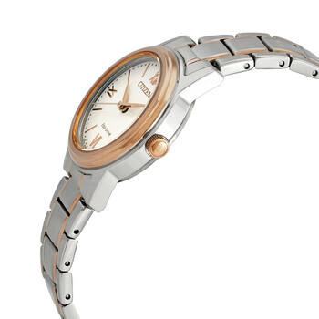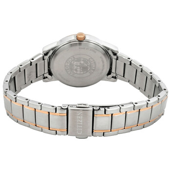 Silver-tone stainless steel case with a two-tone (silver-tone and rose gold-tone) stainless steel bracelet. Fixed rose gold-tone stainless steel bezel. White dial with rose gold-tone hands and index-Roman numeral hour markers. Roman numerals appear at the 3, 6, 9 and 12 o'clock positions. Minute markers around the outer rim. Dial Type: Analog. Date display at the 3 o'clock position. Citizen Caliber Eco-Drive J710 eco-drive movement with a 240-day power reserve. Scratch resistant mineral crystal. Pull / push crown. Solid case back. Round case shape, case size: 30 mm, case thickness: 8.9 mm. Deployment clasp. Water resistant at 100 meters / 330 feet. Functions: date, hour, minute, second, solar-powered. Casual watch style. Watch label: Japan Movt. Citizen Eco-Drive White Dial Two-Tone Ladies Watch FE1226-82A.