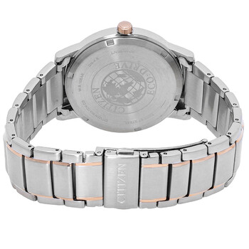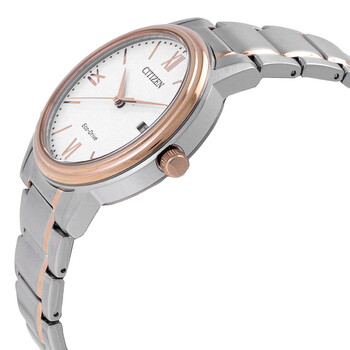 Stainless steel case with a two tone (silver-tone and rose gold tone) stainless steel bracelet. Fixed rose gold-tone bezel. White dial with rose gold-tone hands and index hour markers. Roman numerals appear at the 3, 6, 9 and 12 o'clock positions. Minute markers around the outer rim. Dial Type: Analog. Date display at the 3 o'clock position. Citizen caliber J810 eco-drive movement with a 240-day power reserve. Scratch resistant mineral crystal. Pull / push crown. Solid case back. Round case shape. Case size: 41.5 mm. Case thickness: 10.3 mm. Band width: 20 mm. Fold over clasp with a push button release. Water resistant at 100 meters / 330 feet. Functions: date, hour, minute, second. Casual watch style. Watch label: Japan Movt. Citizen Eco-Drive White Dial Two-tone Men's Watch AW1676-86A.