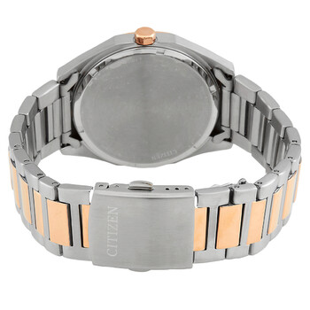 Silver-tone stainless steel case with a two-tone (silver-tone and rose gold-tone) stainless steel bracelet. Fixed rose gold-tone stainless steel bezel. White dial with rose gold-tone hands and index hour markers. Minute markers around the outer rim. Dial Type: Analog. Date display at the 3 o'clock position. Citizen Caliber Eco-Drive E111 eco-drive movement. Scratch resistant mineral crystal. Solid case back. Round case shape, case size: 41 mm. Fold over clasp with a safety release. Water resistant at 100 meters / 330 feet. Functions: date, hour, minute, second, solar-powered. Dress watch style. Watch label: Japan Movt. Citizen Eco-Drive White Dial Two-Tone Men's Watch BM7606-84A.