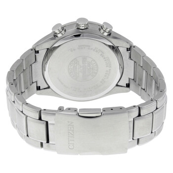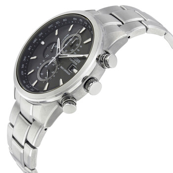 Stainless steel case with a stainless steel bracelet. Fixed stainless steel bezel. Black guilloche dial with luminous silver-tone hands and index hour markers. Minute markers. World time cities around the outer rim. Dial Type: Analog. Luminescent hands and markers. Date display at the 3 o'clock position. Three sub-dials displaying: 60 second, 24 hour and dual 1/100th of a second / day of the week. Quartz movement. Scratch resistant sapphire crystal. Solid case back. Case size: 43 mm. Case thickness: 12 mm. Round case shape. Band width: 24 mm. Band length: 8.5 inches. Fold over clasp with a safety release. Water resistant at 200 meters / 660 feet. Functions: chronograph, date, hour, minute, second. Additional Info: eco-drive is fueled by light so it never needs a battery. Casual watch style. Watch label: Japan Movt. Item Variations: AT8010 58E, AT8010.58E, AT801058E. Citizen Eco-Drive World Chronograph A-T Men's Watch AT8010-58E.