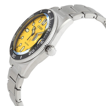 Silver-tone stainless steel case and bracelet. Silver-tone stainless steel bezel with an inlaid black ring. Yellow dial with index hour markers. Minute markers around the outer rim. Dial Type: Analog. Luminescent hands and markers. Date display at the 3 o'clock position. Citizen Caliber Eco-Drive J810 eco-drive movement. Scratch resistant mineral crystal. Solid case back. Round case shape, case size: 43 mm, case thickness: 11.7 mm. Fold over clasp with a safety release. Water resistant at 100 meters / 330 feet. Functions: date, hour, minute, second, solar-powered. Sport watch style. Watch label: Japan Movt. Citizen Eco-Drive Yellow Dial Men's Watch AW1760-81Z.