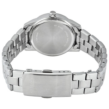 Stainless steel case with a stainless steel bracelet. Fixed stainless steel bezel. Mother of pearl dial with luminous silver-tone hands and index hour markers. Dial Type: Analog. Luminescent hands. Date display at the 3 o'clock position. Quartz movement. Scratch resistant mineral crystal. Pull / push crown. Solid case back. Round case shape. Case size: 28 mm. Case thickness: 7.5 mm. Band width: 12.5 mm. Deployment clasp. Water resistant at 50 meters / 165 feet. Functions: date, hour, minute, second. Casual watch style. Watch label: Japan Movt. Citizen Elegance Mother of Pearl Dial Ladies Watch EU6070-51D.