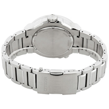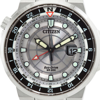 Silver-tone stainless steel case and bracelet. Black bezel. Black hands and dots hour markers. Minute markers around the outer rim. Dial Type: Analog. Luminescent hands and markers. Date display at the 3 o'clock position. Citizen Caliber Eco-Drive B877 eco-drive movement. Scratch resistant sapphire crystal. Solid case back. Round case shape. Fold over clasp with a safety release. Water resistant at 200 meters / 660 feet. Functions: date, GMT, second time zone, hour, minute, second, solar-powered. Endeavor Series. Sport watch style. Watch label: Japan Movt. Citizen Endeavor Eco-Drive GMT Men's Watch BJ7140-53A.