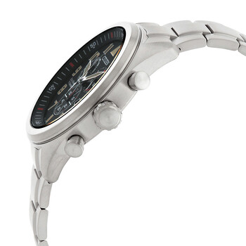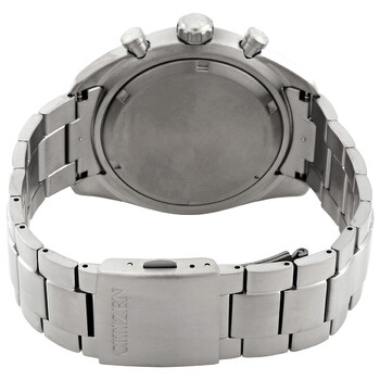 Silver-tone super titanium case and bracelet. Fixed silver-tone super titanium bezel. Black dial with silver-tone hands and Arabic numeral hour markers. Arabic numeral minute markers (at 10 minute intervals). Markers around the outer rim. Dial Type: Analog. Luminescent hands and markers. Date display at the 4 o'clock position. Chronograph - three sub-dials displaying: 60 minute, 60 second and 24 hour. Citizen Caliber Eco-Drive H500 eco-drive movement. Scratch resistant sapphire crystal. Solid case back. Round case shape, case size: 43 mm. Fold over clasp. Water resistant at 100 meters / 330 feet. Functions: chronograph, date, GMT, second time zone, hour, minute, second, solar-powered. Garrison Series. Sport watch style. Watch label: Japan Movt. Citizen Garrison Chronograph Black Dial Men's Watch AT2480-81E.