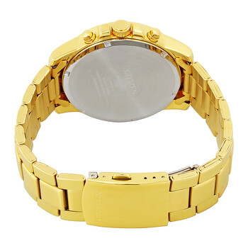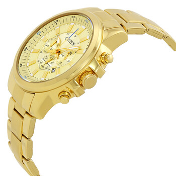 Gold tone stainless steel case with a gold tone stainless steel bracelet. Fixed bezel. Gold tone dial with gold-tone hands and index hour markers. Dial Type: Analog. Luminescent hands and markers. Date display between 4 and 5 o'clock position. Chronograph - three sub-dials displaying: 60 second, 60 minute and 24 hours. Quartz movement. Scratch resistant mineral crystal. Pull / push crown. Solid case back. Case size: 45 mm. Round case shape. Water resistant at 50 meters / 165 feet. Functions: chronograph, date, hour, minute, second. Casual watch style. Citizen Gold Tone Dial Men's Chronograph Watch AN8083-51P.