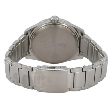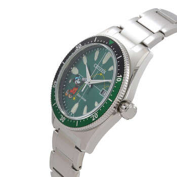 Silver-tone stainless steel case and bracelet. Silver-tone stainless steel bezel. Green dial with silver-tone hands and index hour markers. Minute markers around the outer rim. Dial Type: Analog. Luminescent hands and markers. Date display at the 3 o'clock position. Citizen Caliber Eco-Drive J810 eco-drive movement. Scratch resistant mineral crystal. Solid case back. Round case shape, case size: 43 mm. Fold over clasp with a safety release. Water resistant at 100 meters / 330 feet. Functions: date, hour, minute, second, solar-powered. Mickey Mouse Series. Dress watch style. Watch label: Japan Movt. Citizen Green Dial Men's Tee Time Mickey Watch AW1595-78W.
