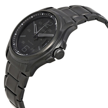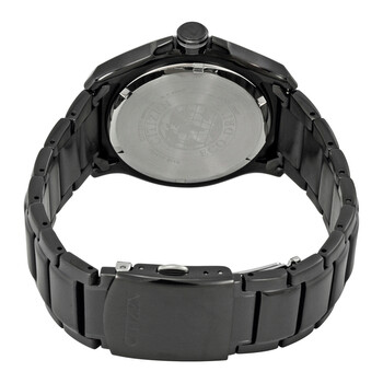 Black ion-plated stainless steel case and bracelet. Fixed black ion-plated bezel. Black dial with luminous black hands and index hour markers. Arabic numerals mark the 6 and 12 o'clock positions. Minute markers around the outer rim. Dial Type: Analog. Luminescent hands and markers. Date display at the 3 o'clock position. Eco-Drive J810 eco-drive movement. Scratch resistant mineral crystal. Solid case back. Case size: 43 mm. Case thickness: 12 mm. Round case shape. Band width: 24 mm. Band length: 9.5 inches. Fold over clasp with a safety release. Water resistant at 100 meters / 330 feet. Functions: date, hour, minute, second. Casual watch style. Citizen HTM Eco-Drive Black Dial Men's Watch AW1354-82E.