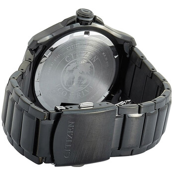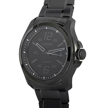 Black stainless steel case and bracelet. Fixed black stainless steel bezel. Black dial with black hands and Arabic numeral hour markers. Minute markers around the outer rim. Dial Type: Analog. Date display at the 3 o'clock position. Citizen Caliber Eco-Drive J810 quartz movement. Solid case back. Round case shape, case size: 43 mm. Deployment with push button release clasp. Water resistant at 100 meters / 330 feet. Functions: date, hour, minute, second, solar-powered. Htm Series. Luxury watch style. Watch label: Japan Movt. Citizen HTM Quartz Black Dial Men's Watch AW1354-82E.