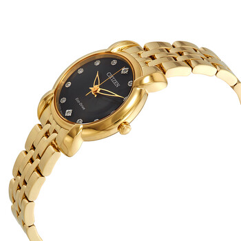Gold-tone stainless steel case with a gold-tone stainless steel bracelet. Fixed gold-tone stainless steel bezel. Black dial with gold-tone hands and diamonds hour markers. Dial Type: Analog. Citizen Caliber E031 eco-drive movement. Scratch resistant sapphire crystal. Solid case back. Round case shape. Case size: 30 mm. Deployment with push button release clasp. Water resistant at 50 meters / 165 feet. Functions: hour, minute, second. Dress watch style. Citizen Jolie Black Diamond Dial Ladies Watch EM0712-59E.
