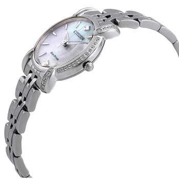 Stainless steel case with a stainless steel bracelet. Fixed stainless steel set with diamonds bezel. Mother of pearl dial with silver-tone hands and index hour markers. Dial Type: Analog. Citizen Caliber E031 eco-drive movement. Scratch resistant sapphire crystal. Pull / push crown. Solid case back. Round case shape. Case size: 30 mm. Case thickness: 7.5 mm. Band width: 14 mm. Fold over clasp with a push button release. Water resistant at 50 meters / 165 feet. Functions: hour, minute, second. Dress watch style. Citizen Jolie Eco-Drive Diamond Mother of Pearl Dial Ladies Watch EM0690-50D.