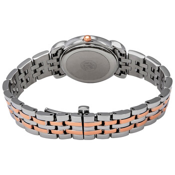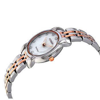 Stainless steel case with a two-tone (silver-tone and rose gold-tone) stainless steel bracelet. Fixed stainless steel bezel. White dial with rose gold-tone skeleton hands and diamond hour markers. Dial Type: Analog. Citizen caliber Eco-Drive E031 eco-drive movement. Scratch resistant sapphire crystal. Pull / push crown. Solid case back. Round case shape. Case size: 30 mm.Case thickness: 8 mm. Band width: 14 mm. Folkd over clasp with a push button release. Water resistant at 50 meters / 165 feet. Functions: hour, minute, second, solar-powered. Casual watch style. Watch label: Japan Made. Citizen Jolie Eco-Drive White Dial Ladies Two Tone Watch EM0716-58A.