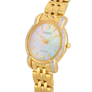 Yellow gold-tone stainless steel case and bracelet. Diamond-set lugs. Fixed yellow gold-tone bezel set with diamonds. Mother of pearl dial with yellow gold-tone skeleton hands and index hour markers. Dial Type: Analog. Citizen Caliber Eco-Drive E031 quartz eco-drive movement. Scratch resistant sapphire crystal. Pull / push crown. Solid case back. Round case shape. Case size: 30 mm. Band width: 14 mm. Deployment clasp with a push button release. Water resistant at 50 meters / 165 feet. Functions: hour, minute, second, solar-powered. Jolie Series. Luxury watch style. Watch label: Japan Movt. Citizen Jolie Quartz Mother of Pearl Dial Ladies Watch EM0692-54D.