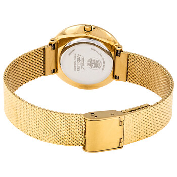 Gold-tone stainless steel case with a gold-tone stainless steel bracelet. Fixed gold-tone stainless steel bezel. Light champagne mother-of-pearl dial with gold-tone hands and index hour markers. Dial Type: Analog. Citizen Caliber Eco-Drive E031 eco-drive movement. Scratch resistant sapphire crystal. Solid case back. Round case shape. Case size: 32 mm. Sliding clasp. Water resistant at 50 meters / 165 feet. Functions: hour, minute, second, solar-powered. Luxury watch style. Watch label: Japan Movt. Citizen L Ambiluna Ladies Watch EM0642-52P.