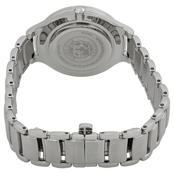 Stainless steel case with a stainless steel bracelet. Fixed stainless steel bezel. Mother of pearl dial with silver-tone hands and Swarovski crystal hour markers. Arabic numerals mark the 6 and 12 o'clock positions. Dial Type: Analog. Citizen caliber Eco-Drive E031 quartz movement. Scratch resistant sapphire crystal. Pull / push crown. Solid case back. Round case shape. Case size: 32 mm. Case thickness: 9 mm. Band width: 12.7 mm. Band length: 8.5 inches. Deployment clasp with a push button release. Water resistant at 50 meters / 165 feet. Functions: hour, minute, second. Dress watch style. Watch label: Japan Movt. Citizen L Crystal Mother of Pearl Dial Ladies Watch EM0550-59D.