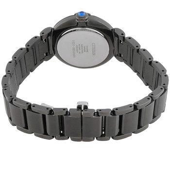 Grey IP stainless steel case and bracelet. Fixed grey IP stainless steel bezel. Black dial with silver-tone hands and index-crystal hour markers. Dial Type: Analog. Citizen Caliber Eco-Drive E031 eco-drive movement. Scratch resistant sapphire crystal. Solid case back. Round case shape, case size: 29.5 mm, case thickness: 8.3 mm. Fold over clasp with a safety release. Water resistant at 50 meters / 165 feet. Functions: hour, minute, second, solar-powered. Citizen L Series. Dress watch style. Watch label: Japan Movt. Citizen L Eco-Drive Black Dial Ladies Watch EM1067-88E.