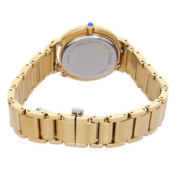 Gold-tone stainless steel case and bracelet. Fixed gold-tone stainless steel bezel. Mother of pearl dial with gold-tone hands and index hour markers. Minute markers around the outer rim. Dial Type: Analog. Citizen Caliber Eco-Drive E031 eco-drive movement. Scratch resistant sapphire crystal. Pull / push crown. Solid case back. Round case shape, case size: 31 mm. Deployment with push button release clasp. Water resistant at 50 meters / 165 feet. Functions: hour, minute, second, solar-powered. Citizen L Series. Casual watch style. Watch label: Japan Movt. Citizen L Eco-Drive Mother of Pearl Dial Ladies Watch EM1092-64D.