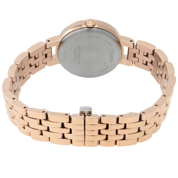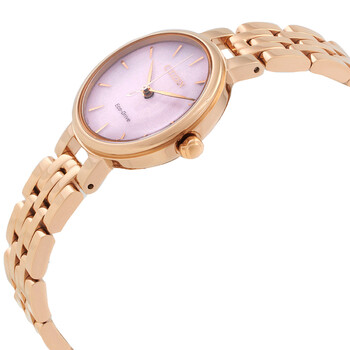 Rose gold IP stainless steel case and bracelet. Fixed rose gold IP stainless steel bezel. Pink dial with rose gold-tone hands and index hour markers. Dial Type: Analog. Citizen Caliber Eco-Drive E031 eco-drive movement. Scratch resistant sapphire crystal. Pull / push crown. Solid case back. Round case shape, case size: 27.7 mm, case thickness: 7.7 mm. Butterfly clasp. Water resistant at 50 meters / 165 feet. Functions: hour, minute, second, solar-powered. Citizen L Series. Dress watch style. Watch label: Japan Movt. Citizen L Eco-Drive Pink Dial Ladies Watch EM0993-82X.