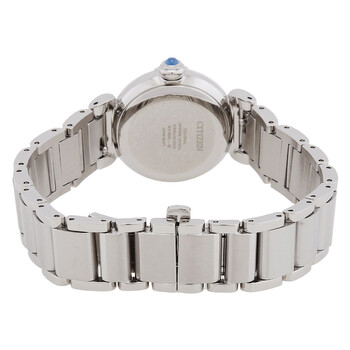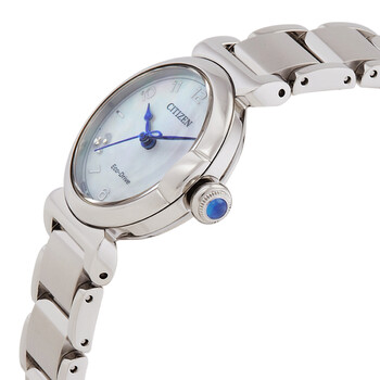 Silver-tone stainless steel case and bracelet. Fixed silver-tone stainless steel bezel. White mother of pearl dial with blue hands and Arabic numeral hour markers. Dial Type: Analog. Citizen Caliber Eco-Drive E031 eco-drive movement. Scratch resistant sapphire crystal. Pull / push crown. Solid case back. Round case shape, case size: 26 mm. Deployment with push button release clasp. Water resistant at 50 meters / 165 feet. Functions: hour, minute, second, solar-powered. L Mae Series. Dress watch style. Watch label: Japan Movt. Citizen L Mae White Mother of Pearl Dial Ladies Watch EM1130-83D.