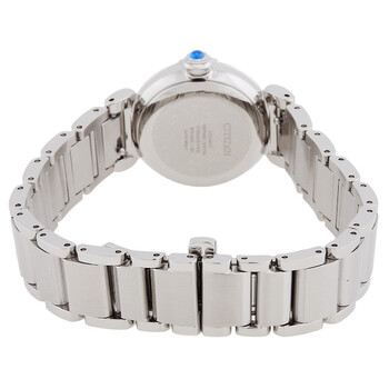 Silver-tone stainless steel case and bracelet. Fixed silver-tone bezel with crystal set. Blue dial with silver-tone hands and Arabic numeral hour markers. Minute markers around the outer rim. Dial Type: Analog. Citizen Caliber Eco-Drive E031 eco-drive movement. Scratch resistant sapphire crystal. Pull / push crown. Solid case back. Round case shape, case size: 26 mm, case thickness: 8.1 mm. Deployment clasp. Water resistant at 50 meters / 165 feet. Functions: hour, minute, second, solar-powered. Citizen L Series. Dress watch style. Watch label: Japan Movt. Citizen L May Bells Crystal Eco-Drive Blue Dial Ladies Watch EM1120-87L.
