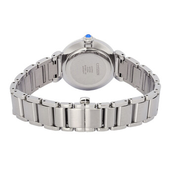 Silver-tone stainless steel case and bracelet. Fixed silver-tone stainless steel bezel. Mother of pearl dial with blue hands and Roman numeral hour markers. Dial Type: Analog. Citizen Caliber Eco-Drive E031 eco-drive movement. Scratch resistant sapphire crystal. Pull / push crown. Solid case back. Round case shape, case size: 29.5 mm, case thickness: 8.3 mm. Deployment with push button release clasp. Water resistant at 50 meters / 165 feet. Functions: hour, minute, second, solar-powered. L Series Series. Dress watch style. Watch label: Japan Movt. Citizen L Series Eco-Drive Mother of Pearl Dial Ladies Watch EM1060-87N.