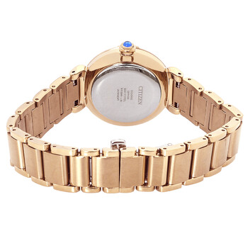 Rose gold-tone stainless steel case and bracelet. Fixed rose gold-tone stainless steel bezel. Mother of pearl dial with rose gold-tone hands and Roman numeral hour markers. Dial Type: Analog. Citizen Caliber Eco-Drive E031 eco-drive movement. Scratch resistant sapphire crystal. Pull / push crown. Solid case back. Round case shape, case size: 29.5 mm, case thickness: 8.3 mm. Deployment with push button release clasp. Water resistant at 50 meters / 165 feet. Functions: hour, minute, second, solar-powered. L Series Series. Dress watch style. Watch label: Japan Movt. Citizen L Series Eco-Drive Mother of Pearl Dial Ladies Watch EM1063-89D.