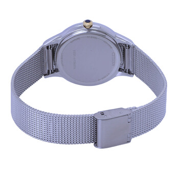 Silver-tone stainless steel case and bracelet. Fixed silver-tone stainless steel bezel. Silver dial with gold-tone hands and index hour markers. Dial Type: Analog. Citizen Caliber Eco-Drive E031 eco-drive movement. Scratch resistant sapphire crystal. Pull / push crown. Solid case back. Round case shape, case size: 32.5 mm, case thickness: 7.6 mm. Water resistant at 50 meters / 165 feet. Functions: hour, minute, second, solar-powered. L Series Series. Dress watch style. Watch label: Japan Movt. Citizen L Series Eco-Drive Silver Dial Ladies Watch EM0814-83A.