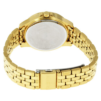 Yellow gold-tone stainless steel case and bracelet. Fixed yellow gold-tone bezel. Silver dial with luminous gold-tone hands and Arabic numeral hour markers. Dial Type: Analog. Luminescent hands. Three multi-function sub-dials displaying: 24 hour, date and day of the week. Quartz movement. Scratch resistant mineral crystal. Solid case back. Case size: 35 mm. Case thickness: 9 mm. Round case shape. Band width: 14 mm. Fold over clasp with a safety release. Water resistant at 50 meters / 165 feet. Functions: date, day, hour, minute, second. Casual watch style. Citizen Ladies Multi-Function Silver Dial Watch ED8102-56A.