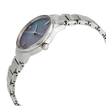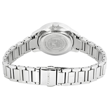 Silver-tone stainless steel case and bracelet. Fixed silver-tone stainless steel bezel. Mother of pearl blue dial with silver-tone hands and index hour markers. Dial Type: Analog. Date display at the 3 o'clock position. Citizen Caliber Eco-Drive E011 eco-drive movement. Scratch resistant sapphire crystal. Pull / push crown. Solid case back. Round case shape, case size: 29.2 mm, case thickness: 8.9 mm. Water resistant at 50 meters / 165 feet. Functions: date, hour, minute, second, solar-powered. Casual watch style. Watch label: Japan Movt. Citizen Ladies Watch EW2590-85N.