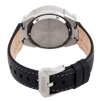 Silver-tone stainless steel case with a black leather strap. Fixed silver-tone stainless steel bezel. Blue dial with silver-tone hands and index hour markers. Tachymeter scale around the outer rim. Dial Type: Analog. Luminescent hands and markers. Date display between 1 and 2 o'clock position. Four sub-dials displaying: 60 second, 60 minute, 12 hour and power reserve indicator. Citizen Caliber Eco-Drive E210 eco-drive movement. Scratch resistant sapphire crystal. Screw down crown. Solid case back. Round case shape, case size: 43.3 mm. Buckle clasp. Water resistant at 200 meters / 660 feet. Functions: chronograph, flyback, alarm, date, day, hour, minute, second, power reserve indicator, solar-powered. Promaster Tsuno Chrono Racer Series. Sport watch style. Watch label: Japan Movt. Citizen Limited Edition Promaster Tsuno Chrono Racer Chronograph Men's Watch AV0088-01L.