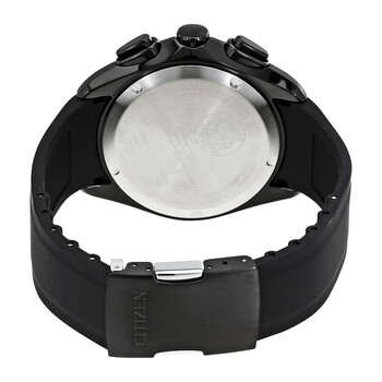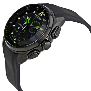 Black ion plated stainless steel case with a black polyurethane strap. Fixed bezel. Black dial with green hands and index hour markers. Minute markers around the outer rim. Dial Type: Analog. Date display at the 4 o'clock position. Eco drive quartz movement. Scratch resistant sapphire crystal. Case size: 46 mm. Round case shape. Deployment with push button clasp. Water resistant at 100 meters / 330 feet. Functions: perpetual calendar, hour, minute, second, chronograph, power reserve indicator, alarm, 12/24 hour format. Additional Info: dual time, solar power (no need to plug in to charge), phone search, visual/vibration alerts. Sport watch style. Citizen Limited Edition Proximity Smartwatch BZ1028-04E.