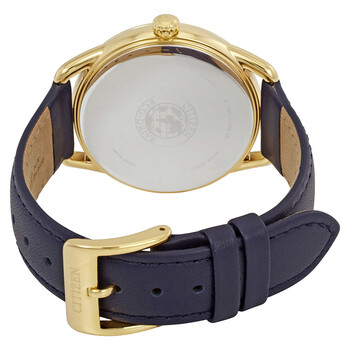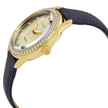 Yellow gold-tone stainless steel case with a navy blue leather strap. Fixed yellow gold-tone bezel set with Swarovski crystals. Champagne dial with luminous yellow gold-tone hands and Swarovski crystal hour markers. Dial Type: Analog. Luminescent hands. Date display at the 3 o'clock position. Citizen caliber Eco-Drive J810 quartz movement. Scratch resistant mineral crystal. Pull / push crown. Solid case back. Round case shape. Case size: 37 mm. Case thickness: 9 mm. Band width: 16 mm. Band length: 7 inches. Tang clasp. Water resistant at 30 meters / 100 feet. Functions: date, hour, minute, second. Dress watch style. Watch label: Japan Movt. Citizen LTR Crystal Champagne Dial Ladies Watch FE6112-09P.