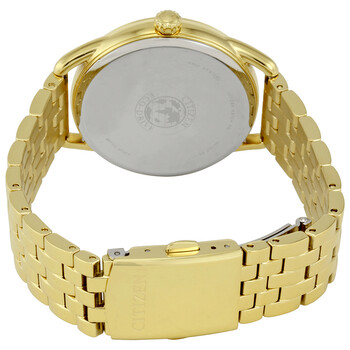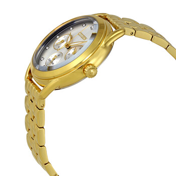 Yellow gold-tone stainless steel case with a yellow gold-tone stainless steel bracelet. Fixed yellow gold-tone stainless steel bezel. Silver dial with luminous yellow gold-tone hands and crystal hour markers. Dial Type: Analog. Luminescent hands. Date display at the 3 o'clock position. Three- date, day of the week, and 24 hours subdials. Citizen Caliber Eco-Drive 8729 eco-drive movement. Scratch resistant mineral crystal. Pull / push crown. Solid case back. Round case shape, case size: 38 mm, case thickness: 10 mm. Band width: 16 mm, band length: 7 inches. Fold over with push button release clasp. Water resistant at 30 meters / 100 feet. Functions: date, day, hour, minute, second. Dress watch style. Watch label: Japan Movt. Citizen LTR Crystal Silver Dial Yellow Gold-tone Ladies Watch FD2052-58A.